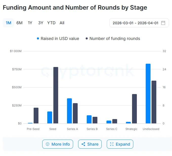 Most of the rounds were seed-stage, receiving $1M-$3M each, while the bulk of funding went to undisclosed late-stage rounds. | Source: Cryptorank