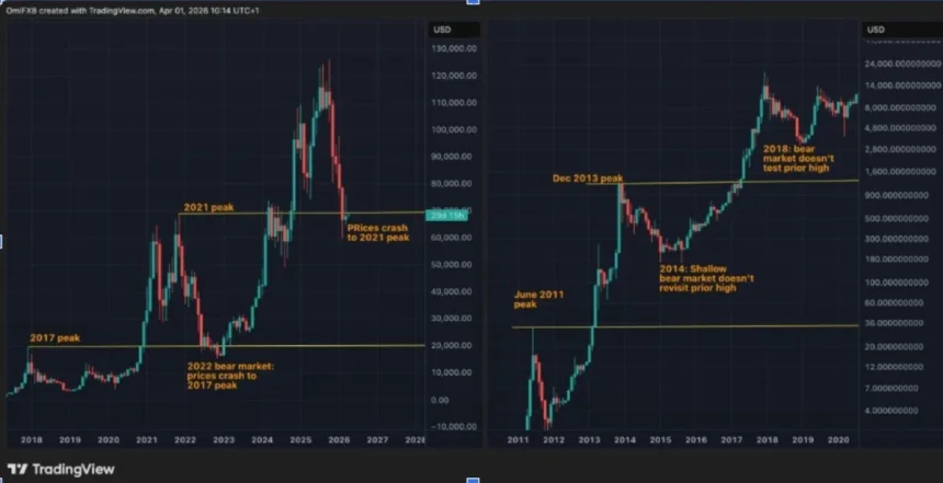Bitcoin now trades near $70,000, a level that carries unusual weight because it matches the record high from the 2019-2022 cycle. Earlier bear markets rarely returned to prior cycle tops, which made old highs seem distant once a new bull market began. The current cycle has broken from that pattern. After reaching more than $126,000 during the 2023-2025 bull run, Bitcoin fell back toward the old peak instead of holding far above it.