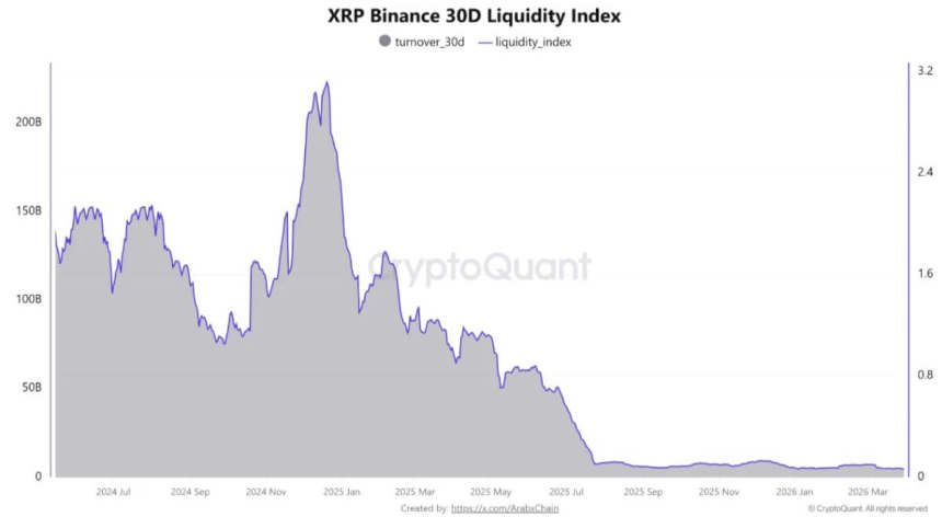 For $XRP, the weakness has been compounded by softer market activity. Data from CryptoQuant showed the tokens 30-day liquidity index on Binance fell to about 0.062, one of the lowest readings in recent periods, while the 30-day turnover index stood at about $4.46 billion.