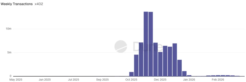 According to Dune Analytics data, the protocol's weekly transaction volume peaked at 13.7 million in November 2025, dropping to 29 thousand - 1.1 million in 2026. $SOL's high TPS (65,000+ ) can carry x402 traffic; Polygon Labs and Base's participation increases $ETH-$POL competition.