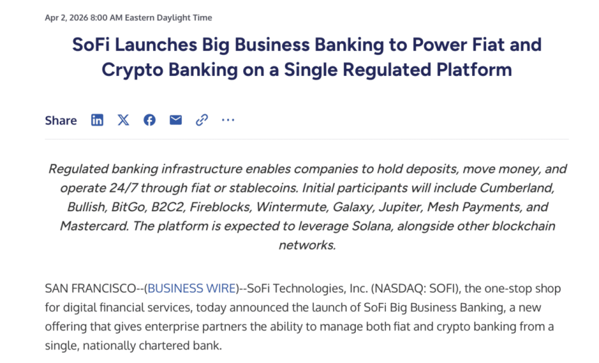 SoFi Technologies has launched Big Business Banking. This enterprise-focused platform brings TradFi to crypto under its nationally chartered bank structure.