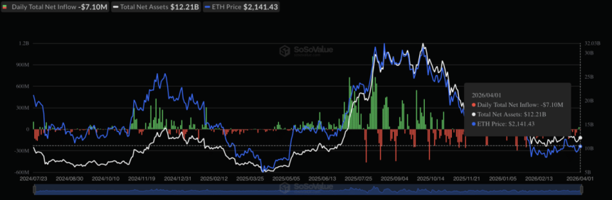 Flows from U.S. Spot investors closed on the 1st of April with a net outflow of approximately $7.10 million, reflecting continued caution among traditional market participants.