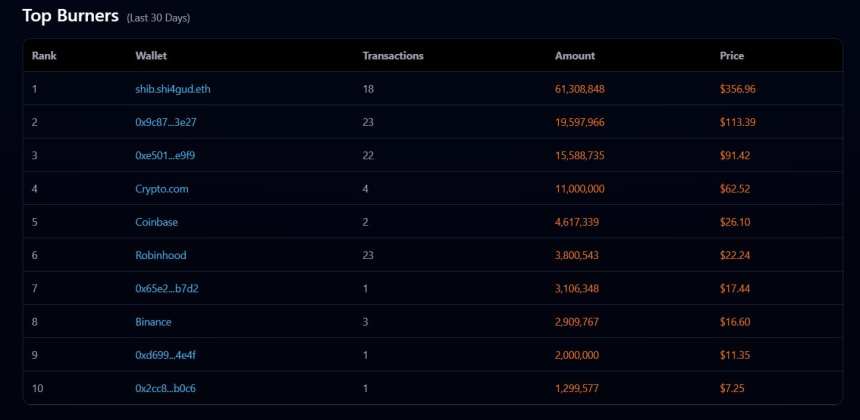 The largest burner among them is Crypto.com, having transferred 11,000,000 $SHIB to unspendable wallets (i.e., burned) over the past month. It is followed by Coinbase (4,617,339 $SHIB), Robinhood (3,800,543 $SHIB) and Binance (2,909,767 $SHIB).