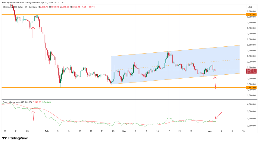 The channel represents the only bullish structure $ETH has maintained since the early February crash. However, three signals underneath the surface, smart money indecision, a bearish RSI divergence, and a whale pattern that historically failed to prevent corrections, suggest the channels survival is increasingly in doubt.