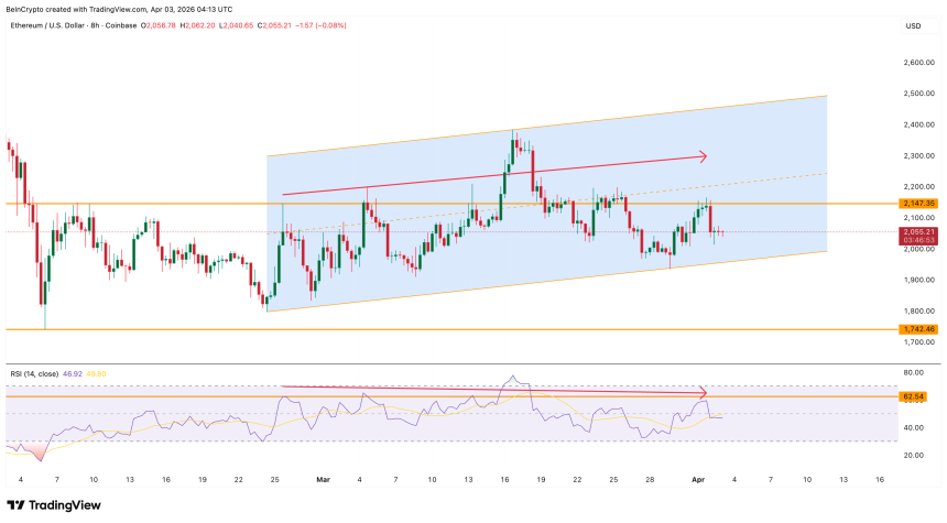 Ethereum ($ETH) price trades near $2,055 on April 3, sitting inside an ascending channel on the 8-hour chart that has guided price action since February 24.