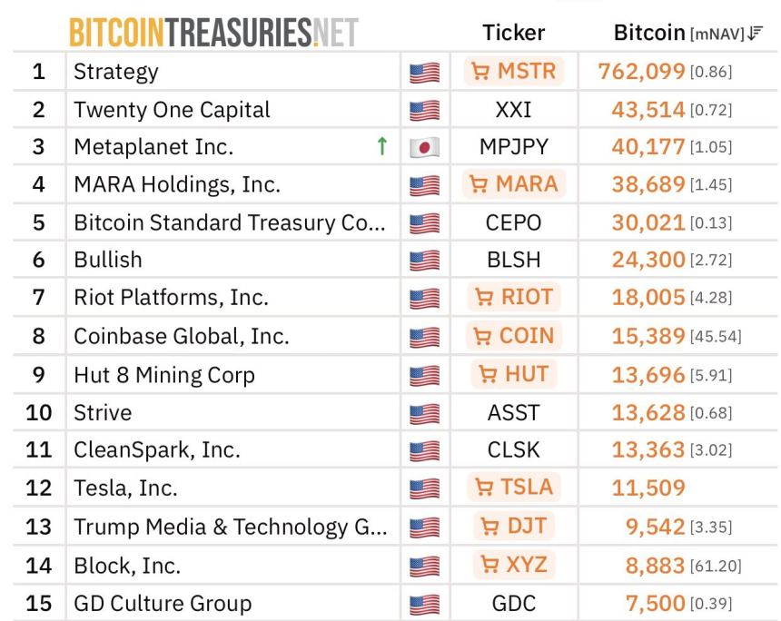 As of late 2025, Metaplanet held 35K $BTC and ranked fourth. During that period, Bitcoin miner MARA ranked third with over 50K $BTC. However, the miner offloaded over 15K $BTC ($1.1 billion) in March, bringing its holdings to 38K $BTC.