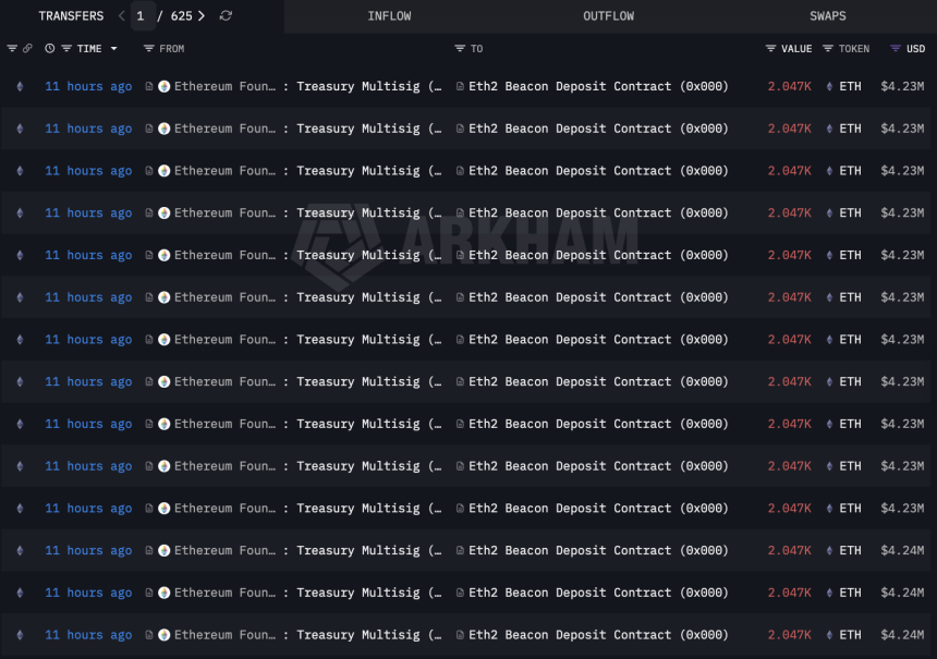 A portion of the $ETH transfers from the Ethereum Foundations treasury to the Ethereum Beacon Deposit Contract for staking. Source: Arkham Intelligence