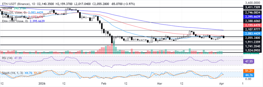In the daily chart, $ETH trades at $2,055. The near-term bias is neutral, with a slight downside tilt, as price holds below the 20- and 50-day Exponential Moving Averages (EMAs), which cap advances at around $2,080 and $2,160.