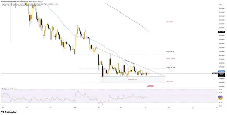 Analysts cited both conditions, but neither chart confirmed a breakout at the time of publication. Ali Charts reported that whale wallets bought heavily between March 31 and April 3, while $DOGEs price held inside a tight $0.087 to $0.101 band.