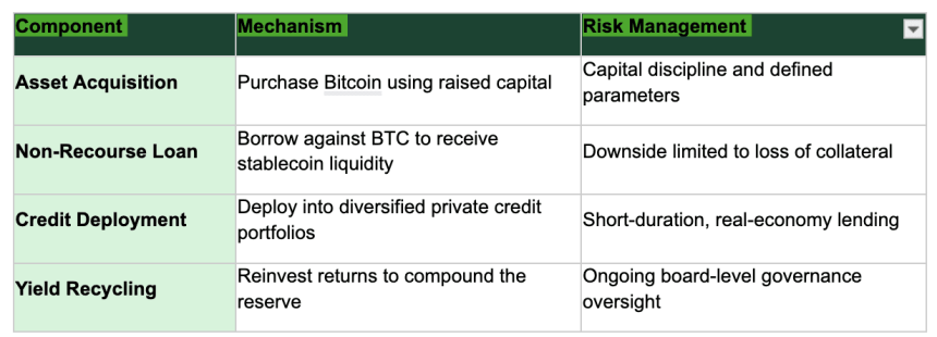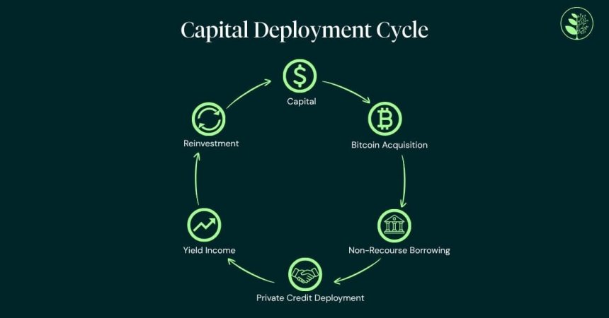 The mechanics draw directly from traditional banking: liquidity management, underwriting, governance and controlled leverage. Under this type of model, a company acquires bitcoin, borrows against those holdings on a non-recourse basis—meaning the downside is limited to the collateral—and deploys the proceeds into diversified private credit portfolios supporting real-economy lending. If bitcoin appreciates, the company retains the upside after repaying the loan, combining potential capital gains with recurring interest income.