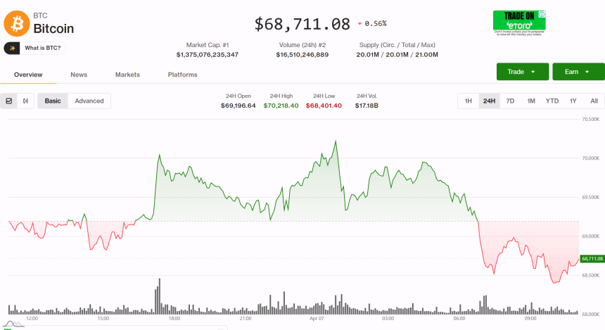 WikiBit 2026-04-07 12:29Bitcoin slid toward $68,000 on Tuesday, with traditional markets closed in Hong Kong for a long week