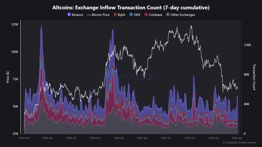A report from analyst Maartunn has identified a transaction spike that stands out precisely because of where it did not appear. On April 2nd, altcoin inflow transactions to Binance jumped to approximately 34,000, the highest reading in two and a half to three months.