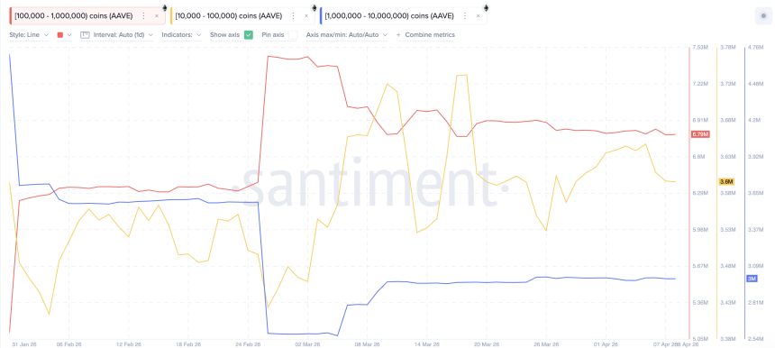 Meanwhile, wallet-level data from Santiment paints a broader picture of distribution. Whales holding between 100,000 and 1 million $AAVE have reduced their collective positions from 7.45 million to 6.49 million tokens since late February. That amounts to a net sell-off of roughly 960,000 $AAVE.