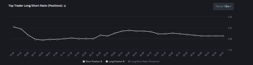 Data from the Top Trader Long/Short Ratio by positions on Binance highlights this disposition. On the 15-minute timeframe, it shows a ratio of 2.12, representing approximately 68% longs and 32% shorts on $SHIB, among the largest traders on Binance.