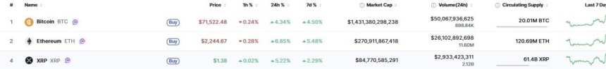 Over the past 24 hours, Bitcoin price gained more than 4% to trade above $71,522 at the time of publication. Ethereum ($ETH) rallied nearly 7% to hover at approximately $2,244 at press time. Meanwhile, $XRP, the native token for $XRP Ledger, surged over 5% on Wednesday to reach $1.38 at the time of reporting, according to metrics from CoinMarketCap.