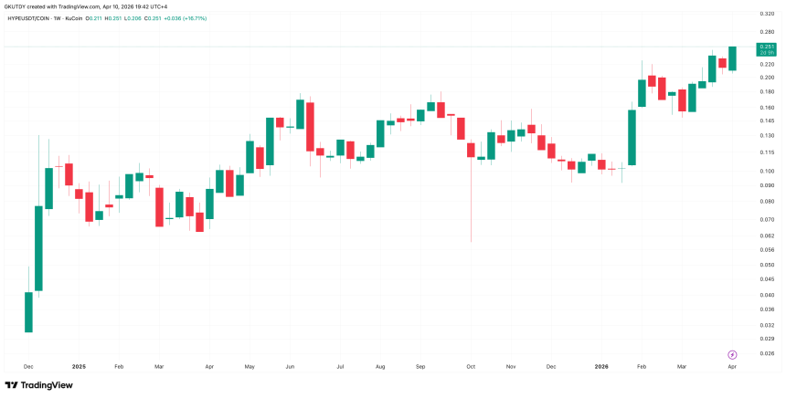 The token of decentralized ecosystem Hyperliquid ($HYPE) has set a new all-time high, not against the dollar, but in a pair against shares of the largest U.S. crypto exchange Coinbase, reaching 0.2514 $HYPE per COIN share, according to the TradingView chart.