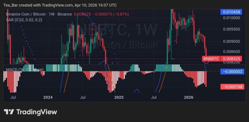 The BNBBTC weekly pair, timestamped 16:07 UTC, trades at 0.008325 (-0.87%). Parabolic SAR dots hover above price, confirming relative weakness against Bitcoin in the near term.