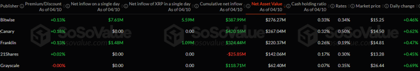 WikiBit 2026-04-11 22:03Multiple $XRP ETFs recorded upward price movements during yesterdays trading session, signaling posi