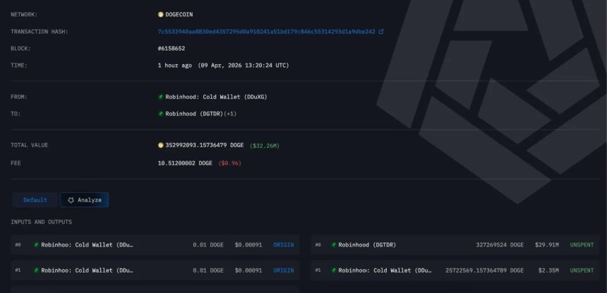 At the same time, on-chain flows added another supportive element to the setup. Whale Alert reported that 327,269,524 $DOGE, worth $29.9 million, moved from Robinhood to an unknown wallet on April 9. That transfer immediately reduced the liquid exchange supply, while $DOGEs price held near $0.0939 above a rising support trendline.
