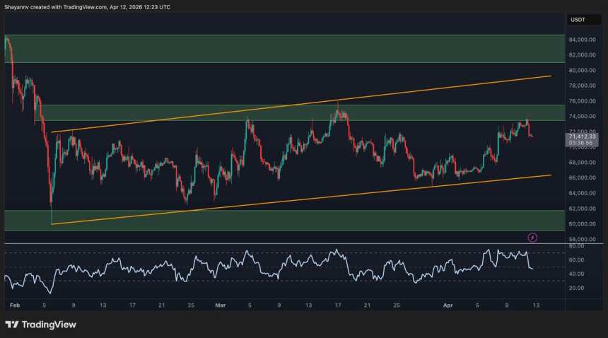 The short-term rising channel that has been forming since the February lows remains the dominant structure on the 4-hour chart, with the asset currently at $71k. The $74-$76k area has recently rejected lower, and the market is at risk of a revisit to the lower boundary of the pattern, currently around $67k.