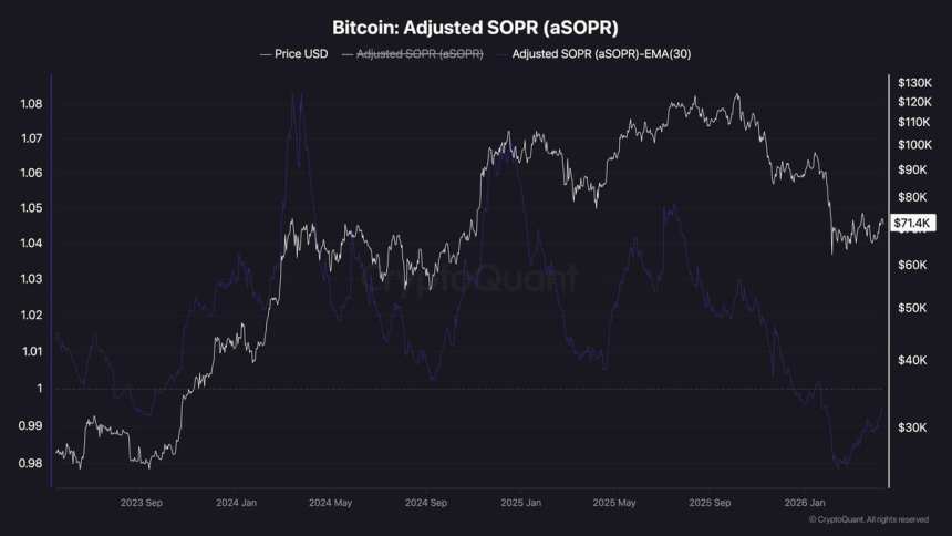 The Adjusted SOPR (aSOPR) is currently printing values below 1.00 — a level that indicates coins are, on aggregate, being spent at a loss. What makes the current reading particularly striking is that the aSOPRs 30-day EMA has declined to levels last seen when Bitcoin was trading around $25k during the final stages of the previous bear market.