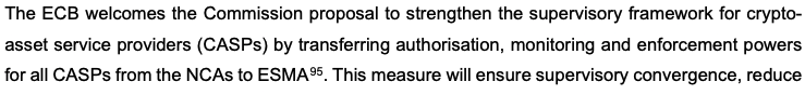 The ECB said that “transferring authorisation, monitoring and enforcement powers for all CASPs” from national regulators to ESMA would “ensure supervisory convergence, reduce fragmentation and mitigate cross-border risks in crypto-asset markets, thereby supporting financial stability and the integrity of the single market.”
