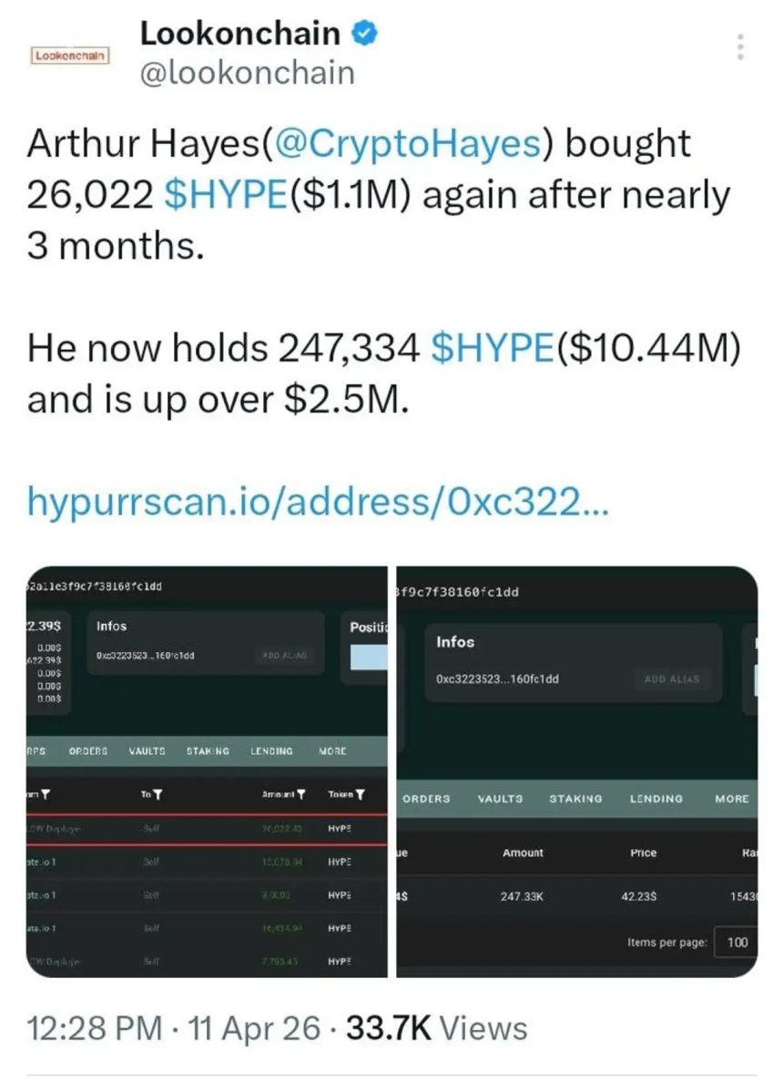 In the volatile world of crypto, few signals carry more weight than a high-profile investor putting fresh capital on the line. On April 11, 2026, BitMEX co-founder and Maelstrom CIO Arthur Hayes did just that—snapping up 26,022 $HYPE tokens for roughly $1.1 million.