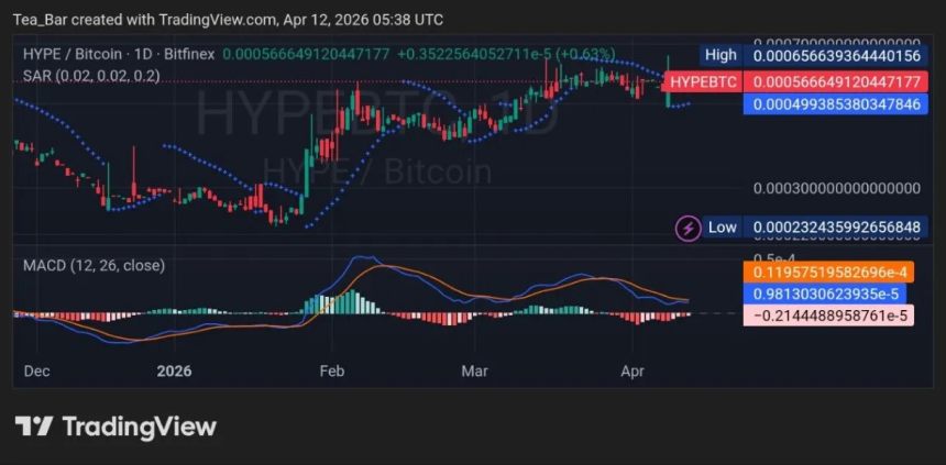 The $HYPE/$BTCpair on Bitfinex paints a similar picture: trading at 0.0005666 $BTC(+0.63% today), it has recovered from deeper March dips while respecting a rising channel.