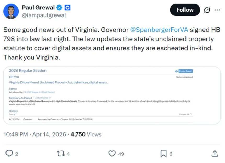 Virginia has passed a new law that could quietly fix one of crypto industrys biggest long-standing issues: what happens when digital assets are left unclaimed. Governor Abigail Spanberger signed House Bill 798 into law, creating a formal framework for handling dormant crypto accounts. The change allows the preservation of assets like Bitcoin (BTC) instead of selling them off at potentially unfavorable prices.