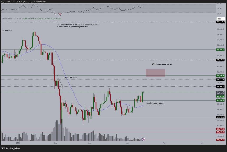 Van de Poppe also highlighted the $72,000 support as a crucial point. As long as Bitcoin remains above this zone, he believes there is over a 70% chance that the price trades above $80,000 before the end of April.