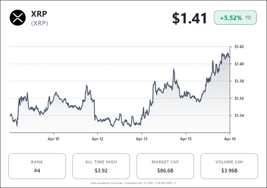 At the time of writing, CoinCodex data shows $XRP trading at $1.41, positioning it in a key zone where short-term volatility is colliding with longer-term accumulation trends.