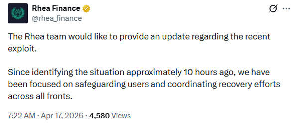 Rhea Finance updates its users on the exploit. Source: Rhea Finance