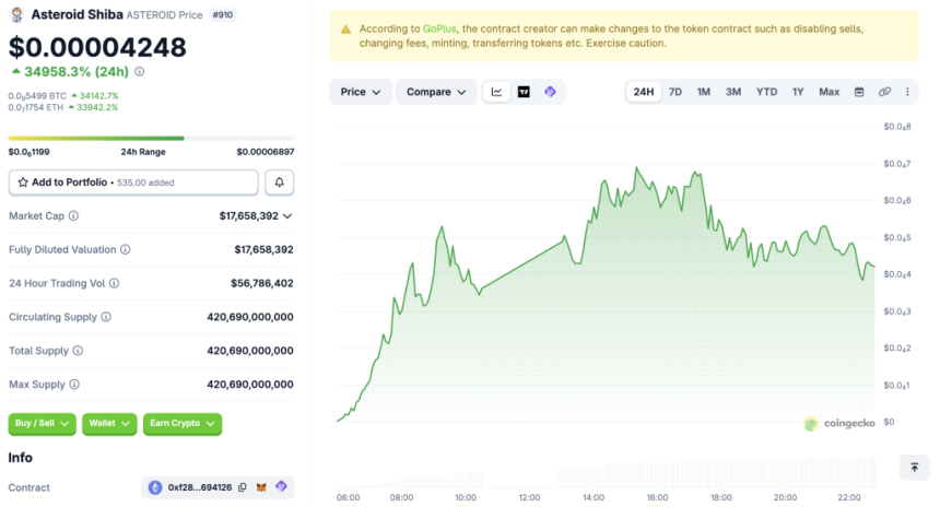 A new memecoin, Asteroid, has taken the crypto market by storm, jumping from a tiny $50K market cap to over $20M+ in just hours. Data shared by Arkham shows how quickly the token went parabolic, leaving traders scrambling to understand what just happened.