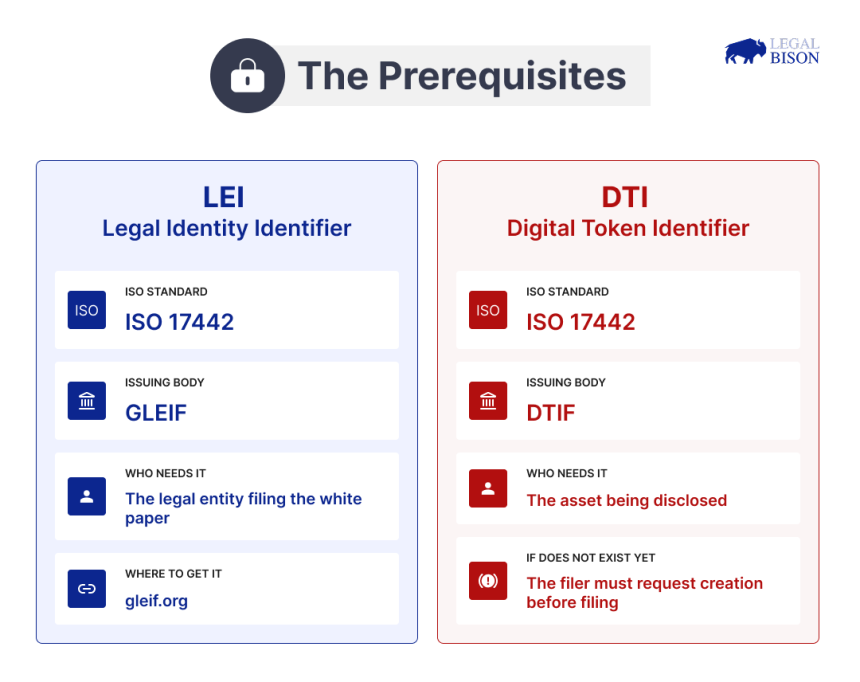 Two mandatory identifiers are prerequisites for any compliant white paper. Both are drawn from international standards that predate MiCA. The regulation did not create them, it made them compulsory.