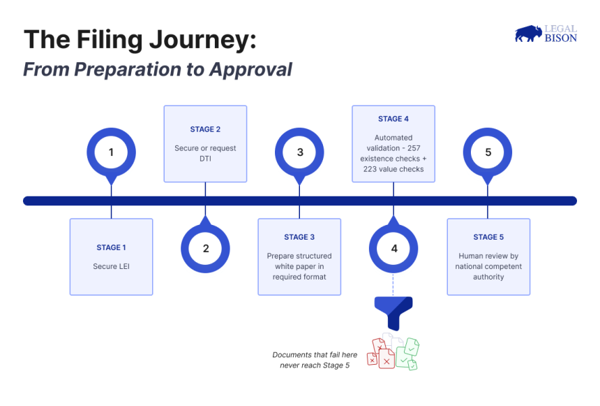 A white paper that does not contain a valid LEI and DTI fails automated validation before any human reviewer sees it. Projects that reach the submission stage without both codes in hand face a full restart.