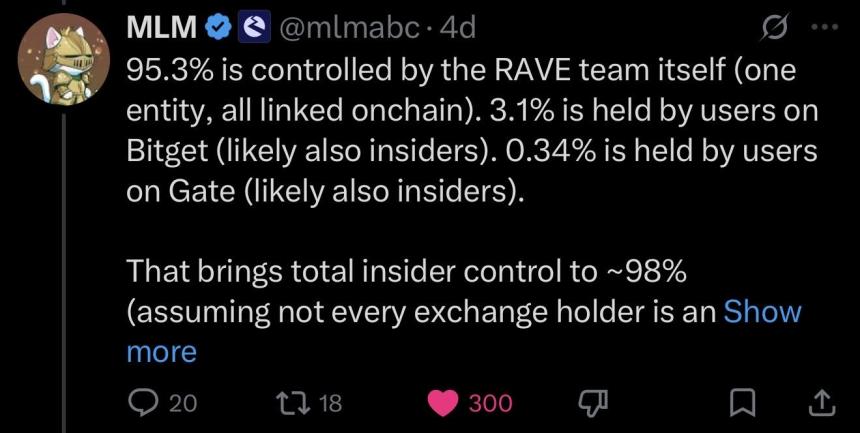 $RAVE has surged 10,000% in 30 days, yet a tightly controlled supply structure drives this move and explains its intensity.