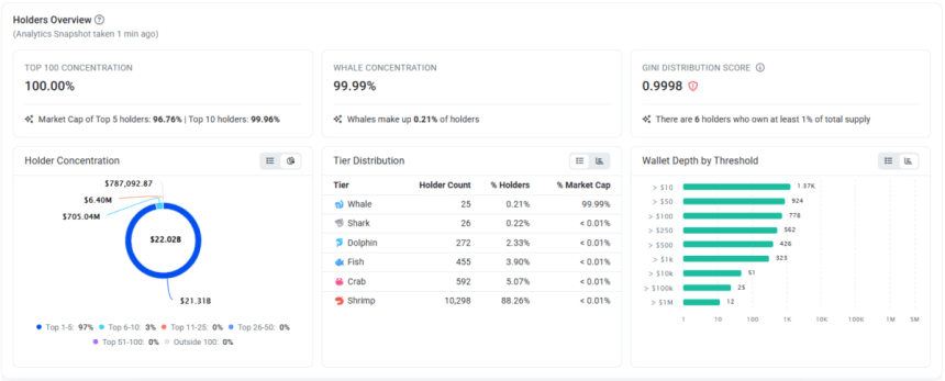 Even so, that figure overstates the true float, because a single entity controls around 95% of the supply, while another 3–4% sits on exchanges in linked wallets.