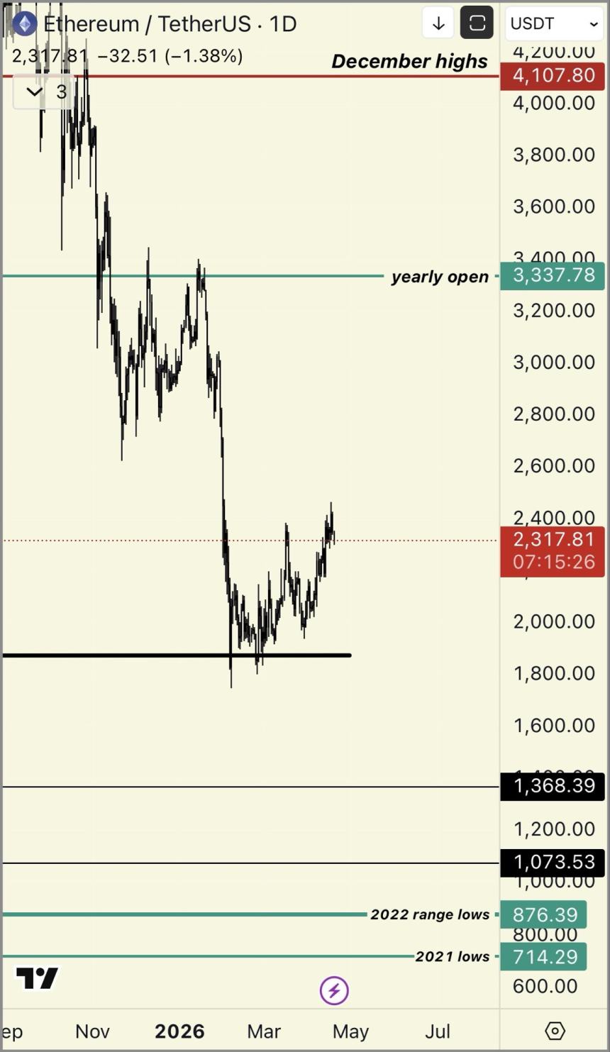 From Ansem's technical analysis perspective, Ethereum is in a “prolonged downtrend” after failing to break multiyear resistance levels. The trader suggests opening short positions at current levels around $2,317, targeting a move below $1,000 by the end of 2026.