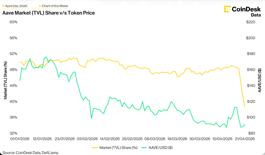 Aave's TVL market share has dropped sharply from ~51.5% in February to ~39% today following the April 18 KelpDAO rsETH exploit, which froze rsETH markets and triggered deposit withdrawals. Active loan share proved stickier, falling only ~2% (54% to ~52%), as existing borrowers couldn't easily unwind. The AAVE token is down ~50% from its January peak, pricing in both bad debt risk and the reputational cost of being DeFi lending's largest venue when a collateral asset failed.