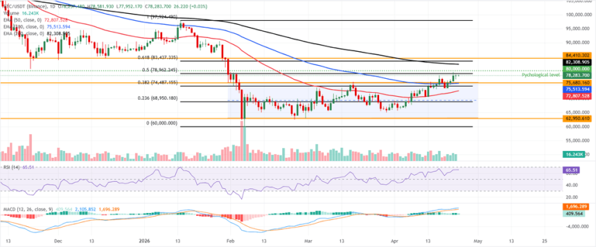 Bitcoin is trading at $78,200 on Friday, maintaining a constructive bullish bias as it holds above the 50-day and 100-day exponential moving averages (EMAs) at roughly $72,807 and $75,513, respectively. $BTC has also broken above the top of its parallel channel near $75,680, turning that boundary into near-term support, while remaining below the 200-day EMA at about $82,309, which still caps the broader upside.