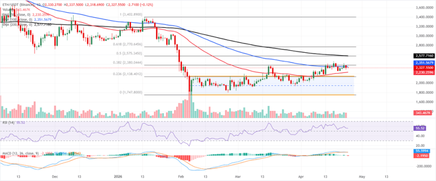 Ethereum is trading at $2,327 on Friday, maintaining a neutral to slightly constructive bias as it holds above the 50-day EMA near $2,230 while remaining capped below the 100-day EMA at roughly $2,351.