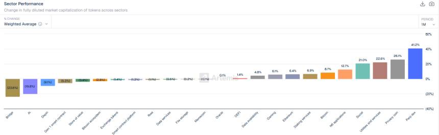Moreover, the Perp DEX sector has been the most bullish over the past month, aligning with $HYPEs sentiment. The sector reported gains of 41.2%, almost double that of second-placed privacy coins with 26%.