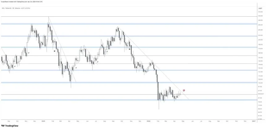 Solanas 3 day chart shows $SOL pressing against a descending trendline that has capped price action since late 2025. The chart also shows a long consolidation above the lower support zone near $76 to $81.