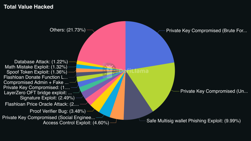 The pie chart shows the breakdown of total losses suffered in crypto hacks by different methods of attack, including private key compromises, phishing exploits, access control issues and other smart-contract vulnerabilities.