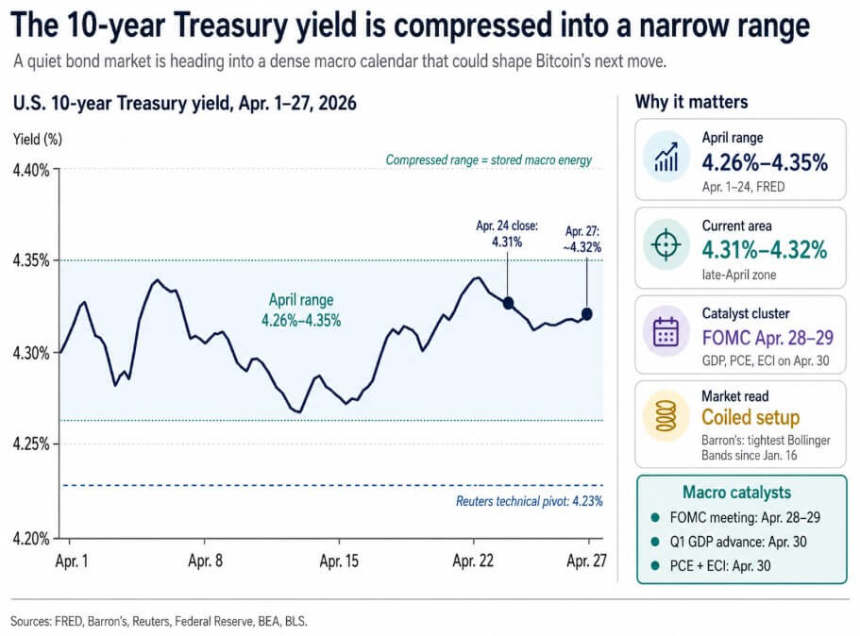 Everyone watching Bitcoin this week is watching the Federal Reserve, while the more important tell may be sitting in the Treasury market, where the 10-year yield has compressed into one of its tightest ranges of the year just as a dense macro calendar opens.