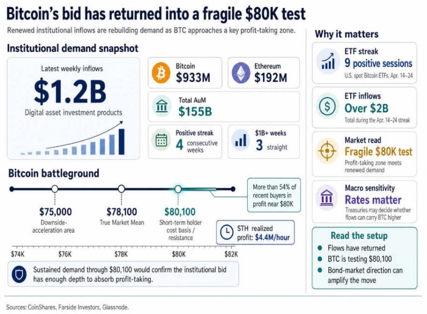 Bitcoin drew $1.2 billion in weekly institutional inflows across four consecutive positive weeks while pressing into a profit-taking zone at $80,100.What on-chain data shows