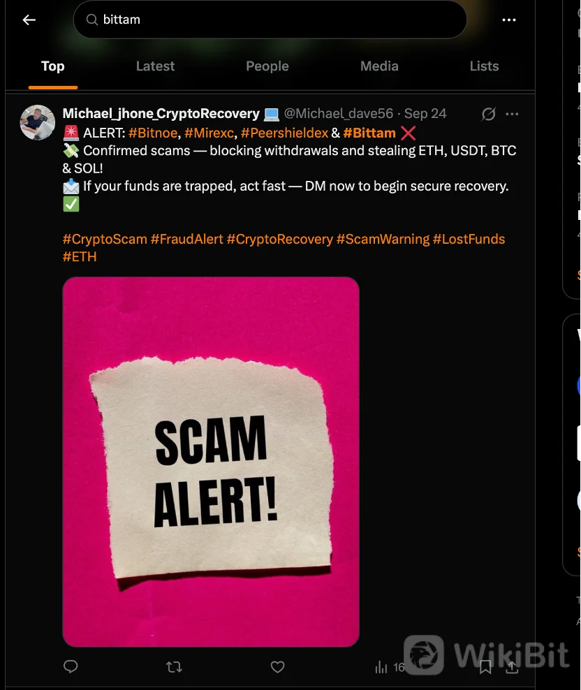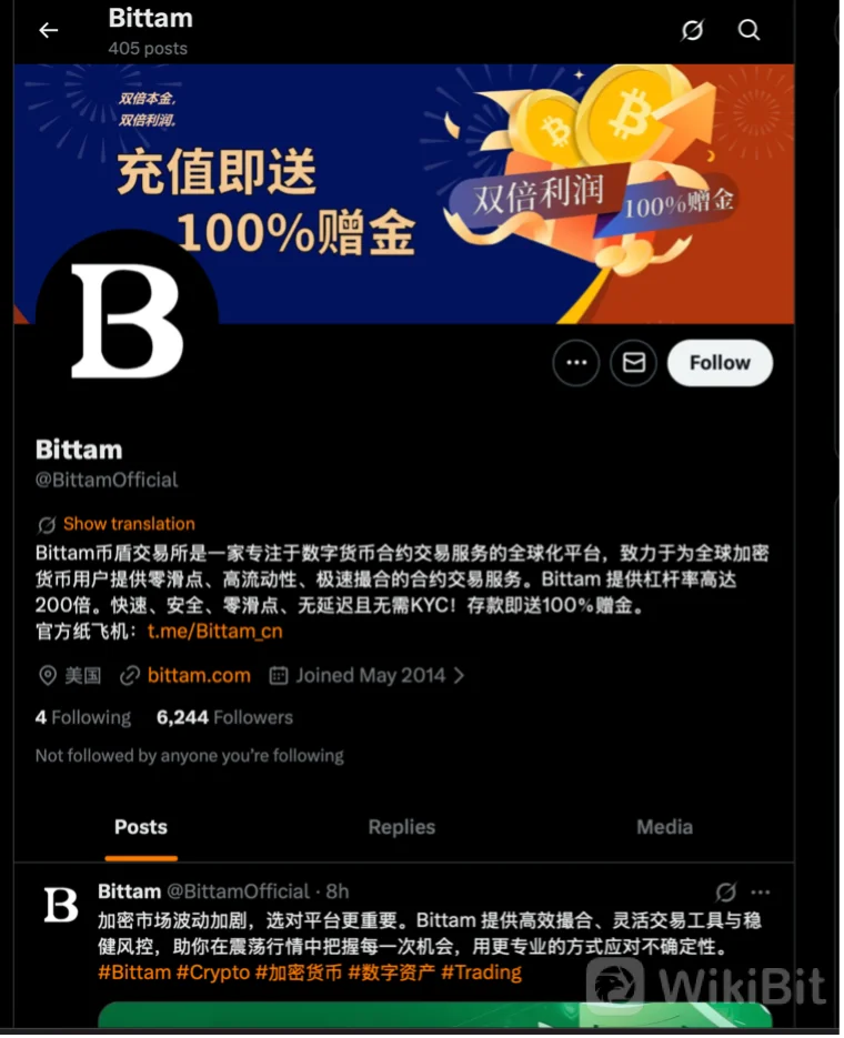 Recently, a cryptocurrency trading platform named Bittam has attracted significant attention on social networks. Its high-profile promotions, featuring claims like “100% Bonus” and “Zero Slippage,” have drawn the eyes of many investors. However, after an analysis by the WikiBit investigation team combining on-chain data, third-party authoritative ratings, and user feedback, serious doubts have emerged regarding the platform's compliance, operational history, and fund security.