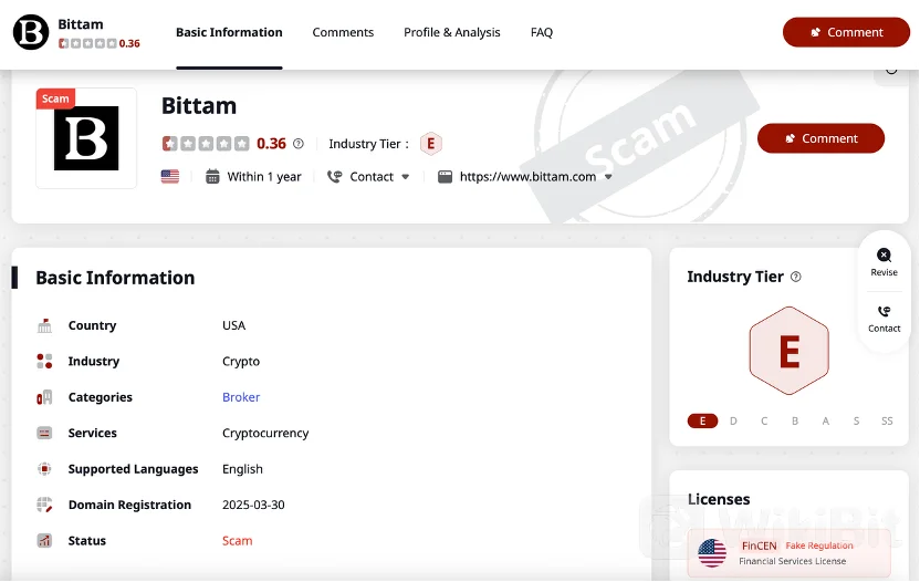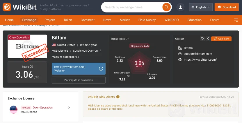 WikiBit 2025-12-23 11:19Recently, a cryptocurrency trading platform named Bittam has attracted significant attention on social networks. Its high-profile promotions, featuring claims like "100% Bonus" and "Zero Slippage," have drawn the eyes of many investors. However, after an analysis by the WikiBit investigation team combining on-chain data, third-party authoritative ratings, and user feedback, serious doubts have emerged regarding the platform's compliance, operational history, and fund security.