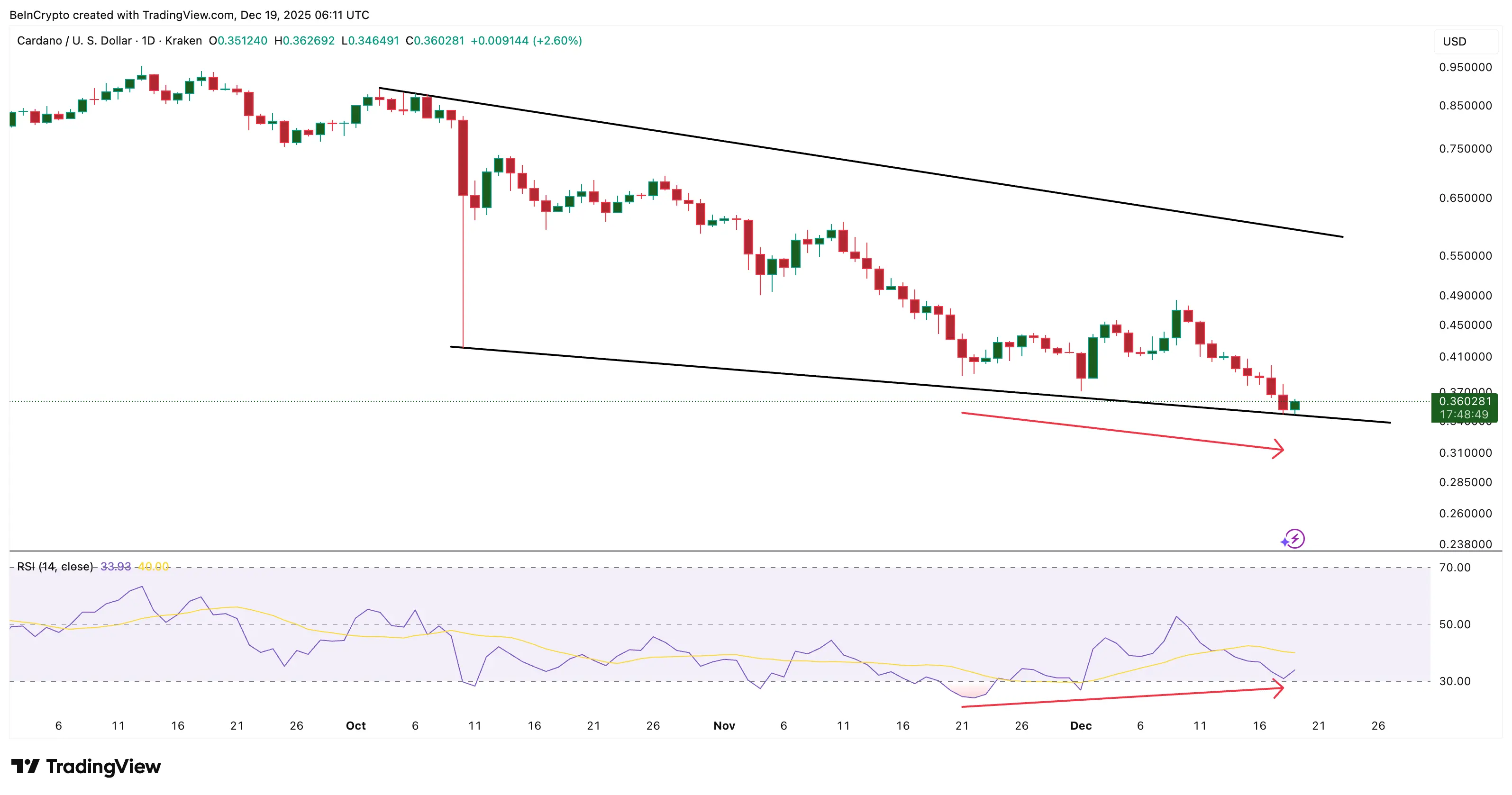 Cardano remains under pressure as bearish momentum persists, with traders watching whether the price