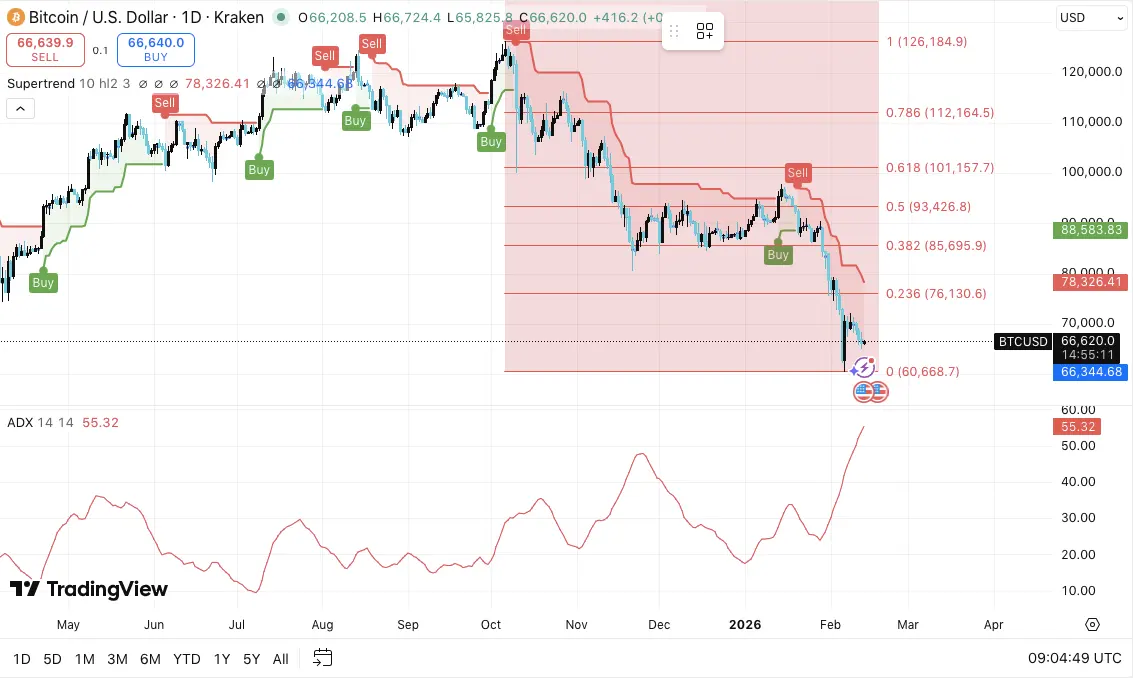 Bitcoins daily chart reflects a broad shift in market structure as price action moves deeper into a